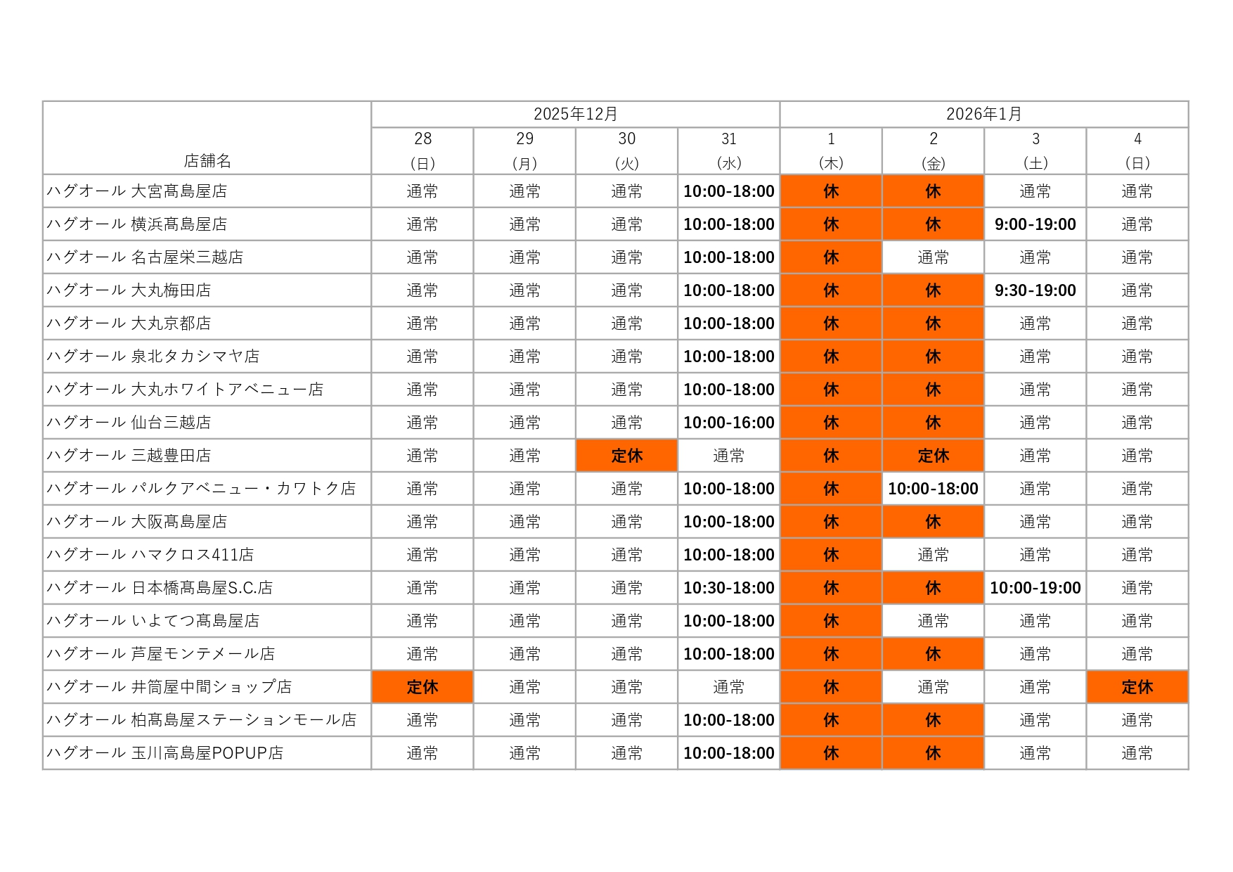 お客様各位平素より格別のご愛顧を賜り、厚く御礼申し上げます。ハグオール各店舗の年末年始の営業についてご案内申し上げます。誠に勝手ながら、一部営業時間を変更させていただきます。何卒ご理解賜りますようお願い申し上げます。なお、最新の情報につきましては、各施設の案内も合わせてご確認くださいますようお願い申し上げます。